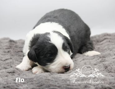 Flo is a F1 small standard sheepadoodle, with black and white markings. She will make a great companion and will be one gorgeous lap dog!